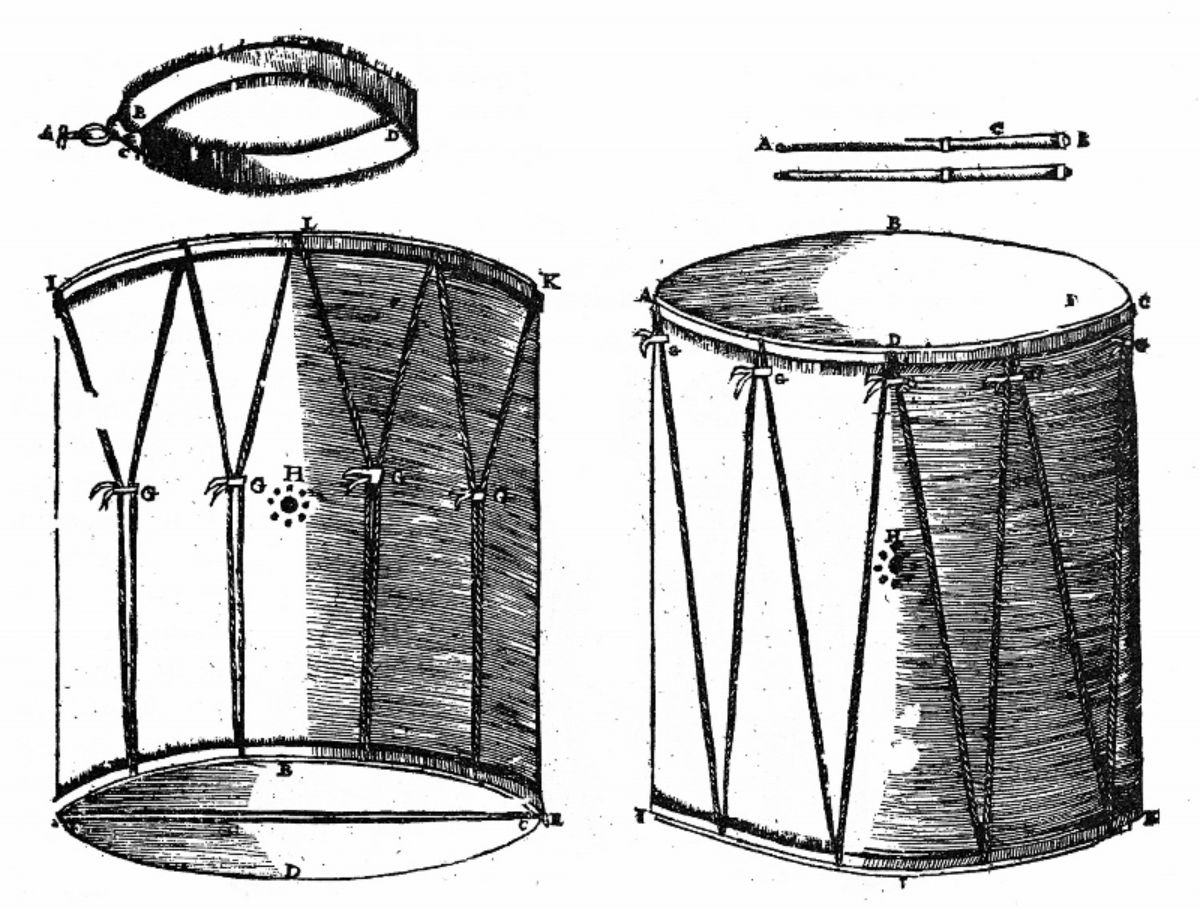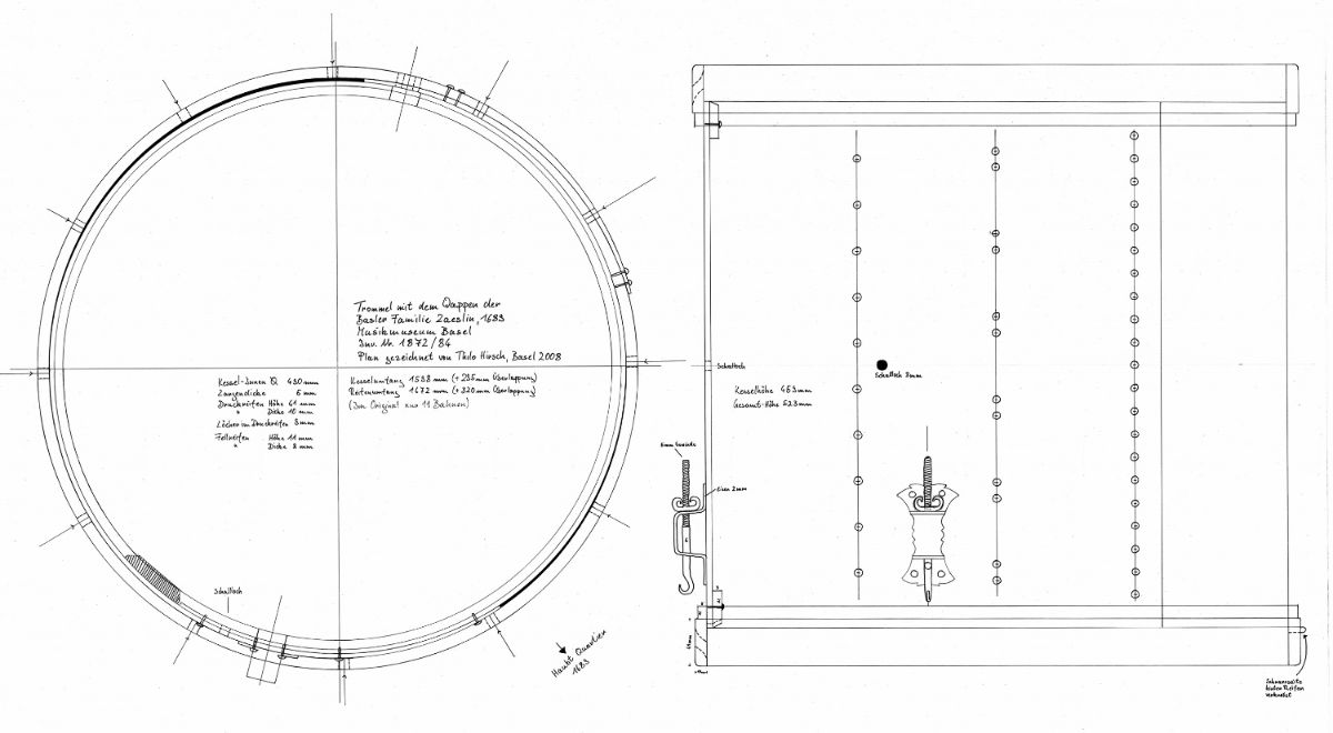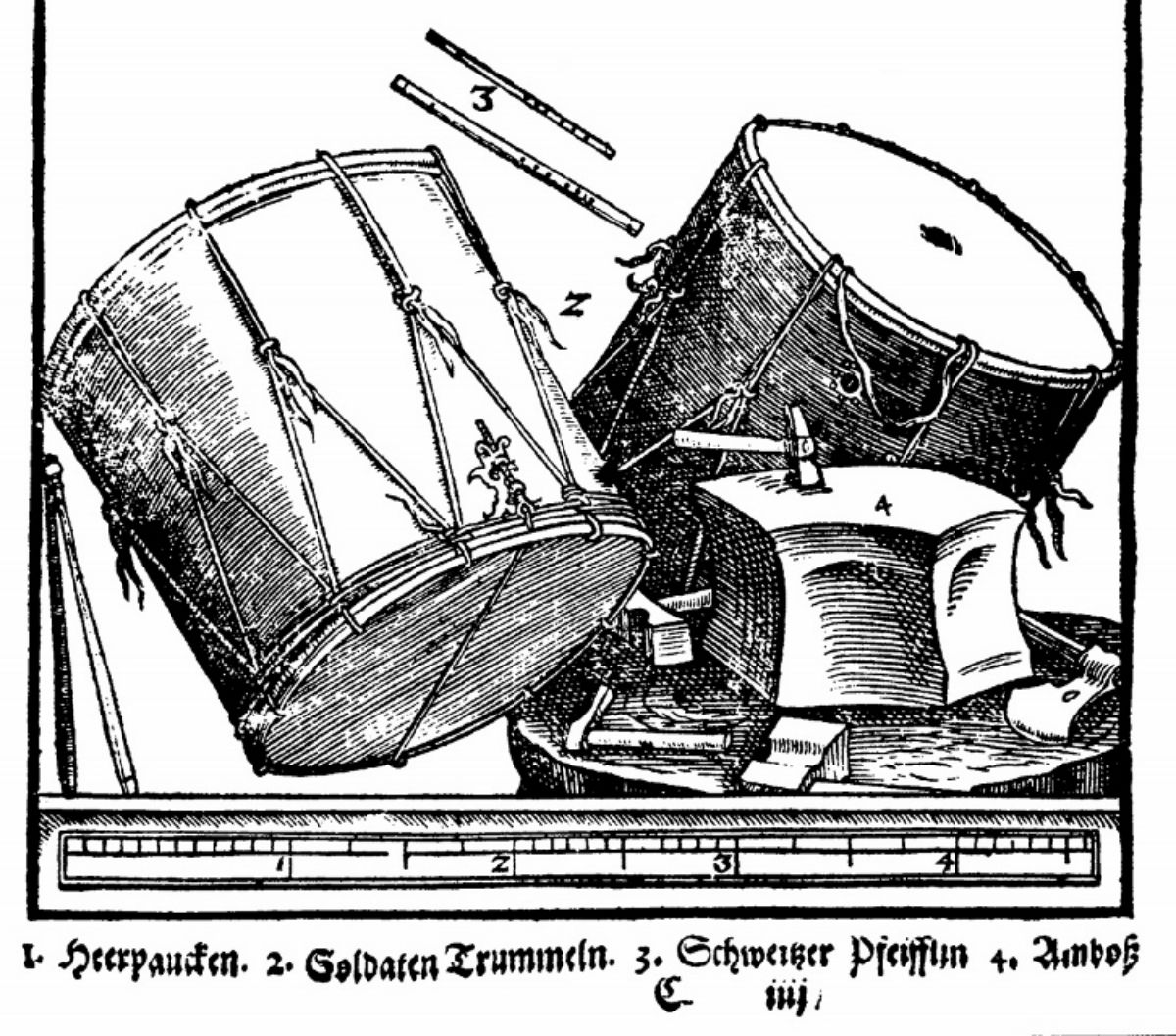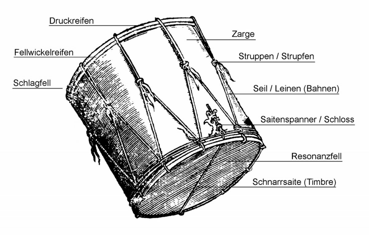 Haben die französischen Truppen vielleicht die Instrumente von den Schweizern übernommen, und schlussendlich „Urschweizer“ Stücke gespielt, wie Georg Duthaler 1985 in seinem Buch Trommeln und Pfeifen in Basel vermutet? Oder sind in den Schweizer Ordonnanzen aus dem 18. und 19. Jahrhundert vielleicht immer noch Stücke enthalten, die am französischen Hof im 17. Jahrhundert von J.-B. Lully komponiert wurden? All diesen Fragen soll in diesem Artikel nachgegangen werden. Zur besseren Verständlichkeit der verwendeten Fachausdrücke sind im folgenden Bild die verschiedenen Teile der Trommel und deren Namen veranschaulicht.