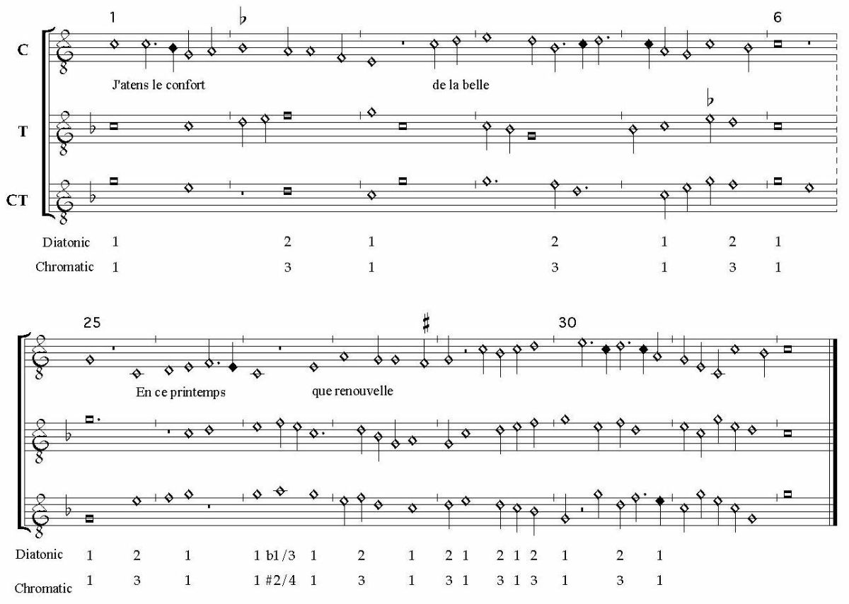 The anonymous Aux ce bon youre delabonestren (Example 9) has been linked to the repertory of the basse danse because its Tenor is preserved in stroke notation. [64] The opening of the Contra stands out for its consonant intervals that combine to outline the interval of a ninth and rhythmic repetitions at cadential bridges. This setting also warrants notice for passages in which the Cantus mutates to “mi” on f' (mm. 3 and 12).